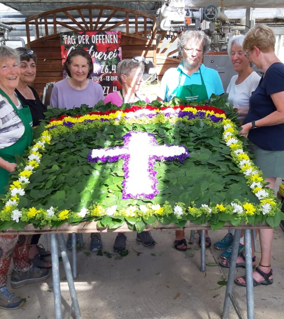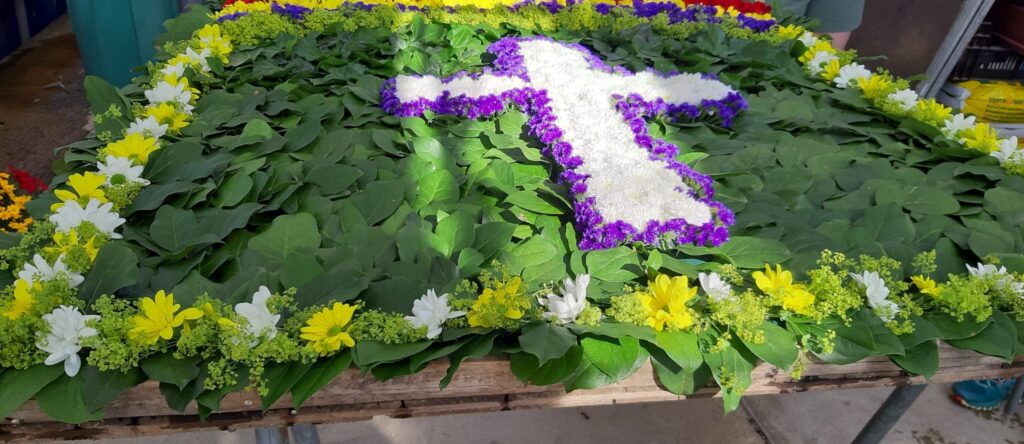 Auch dieses Jahr haben wieder fleißige Hände des Unterwössener Gartenbauvereins ein Altarbild für Fronleichnam aus Blättern und Blüten gesteckt.