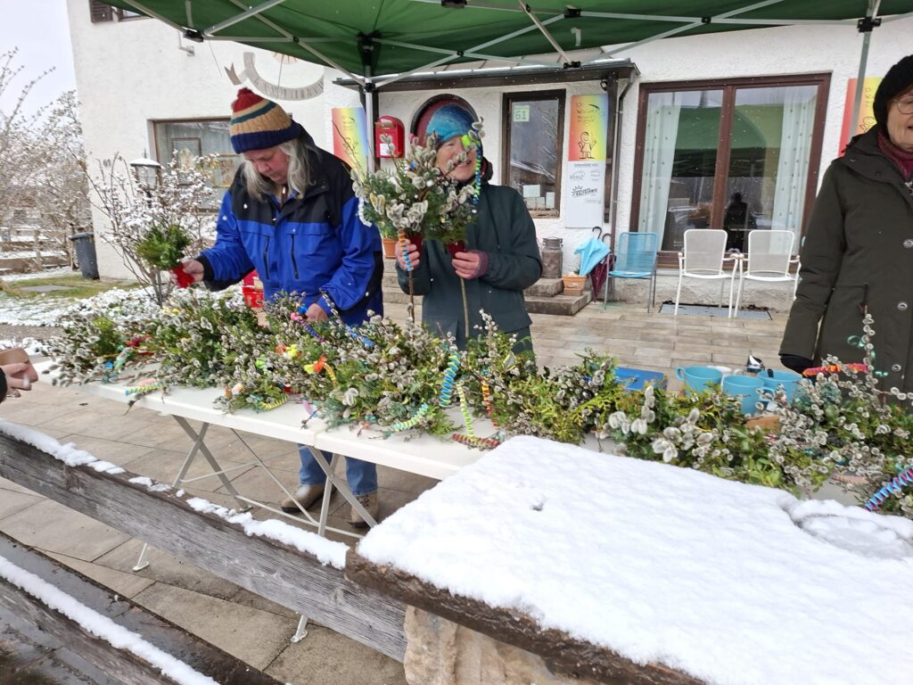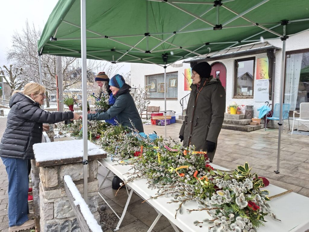 Trotz eisiger Morgenkälte ließen sich Yarmila Schwegmann, Gerti Brandstetter und Monika Haunerdinger nicht beirren: Mit viel Geschick und Liebe zum Detail in der Beratung boten sie die kunstvoll gebundenen Palmbuschen des Gartenbauvereins vor dem Wössner Treff an. Und auch die Kundschaft zeigte sich wetterfest. Viele nutzten die Gelegenheit, um sich rechtzeitig für den Palmsonntag einzudecken und die handgefertigten Palmbuschen zahlreich zu erwerben.